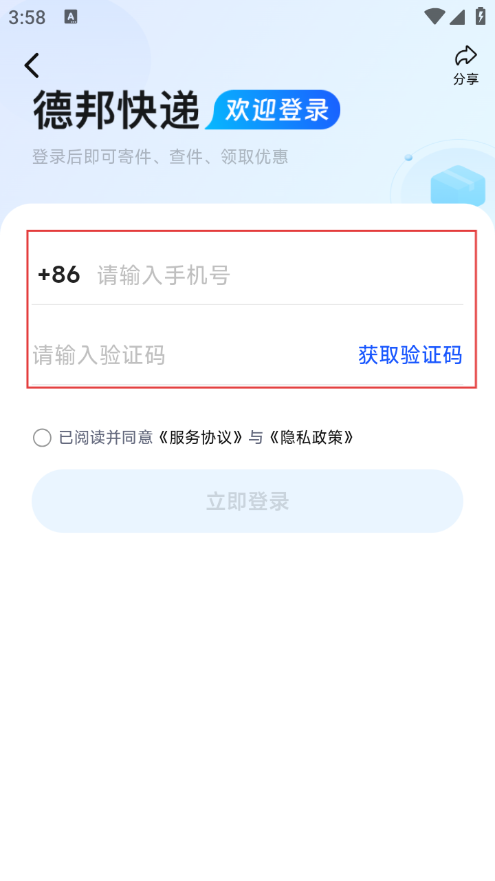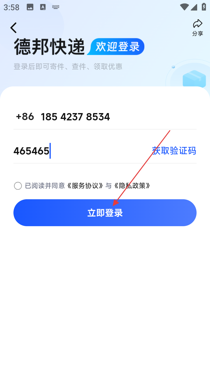 4、输入验证码后,点击【立即登录】按钮,即可完成登录操作,享受寄件、查件、领取优惠等服务。