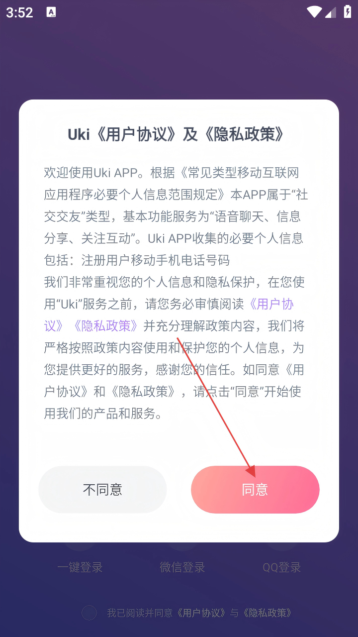 1、打开UkiAPP,在弹出的《用户协议》及《隐私政策》提示框中,点击【同意】。