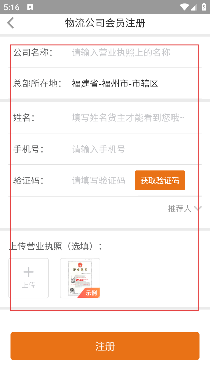 4、在注册信息页,填【公司名称】【姓名】【手机号】等信息,上传执照后点【注册】。