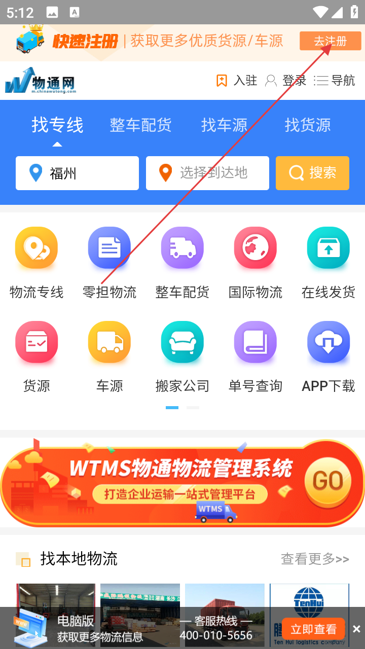 1、打开物通网首页,点击顶部【去注册】,进入登录注册页。