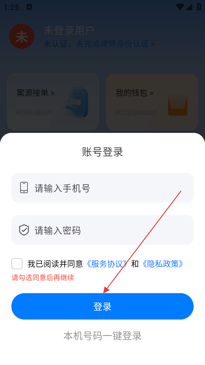 3、在账号登录页面,输入手机号和密码,勾选【我已阅读并同意《服务协议》和《隐私政策》】。