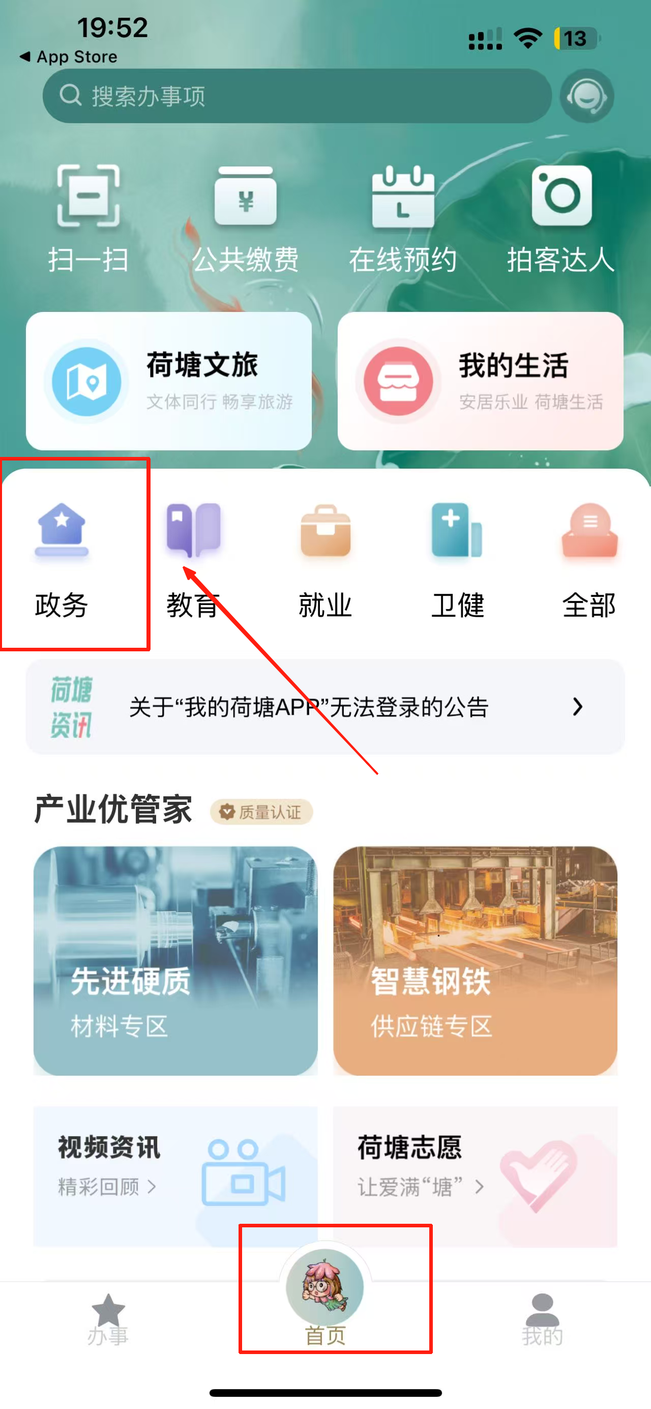1、进入首页并选择政务:在首页点击“政务”图标,进入政务办理页面。