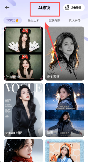 3、浏览TOP20 AI滤镜,挑墨金素描或VOGUE封面,一键套用秒变大片。