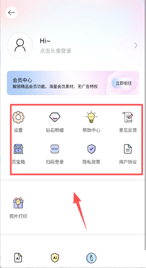 4、点头像进入会员中心,扫码登录账号,解锁素材、去广告等全部特权。