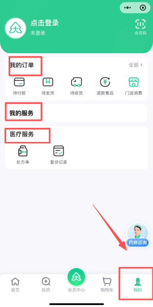 4、在“我的”页面查看订单与处方记录,随时使用药师咨询与复诊服务。