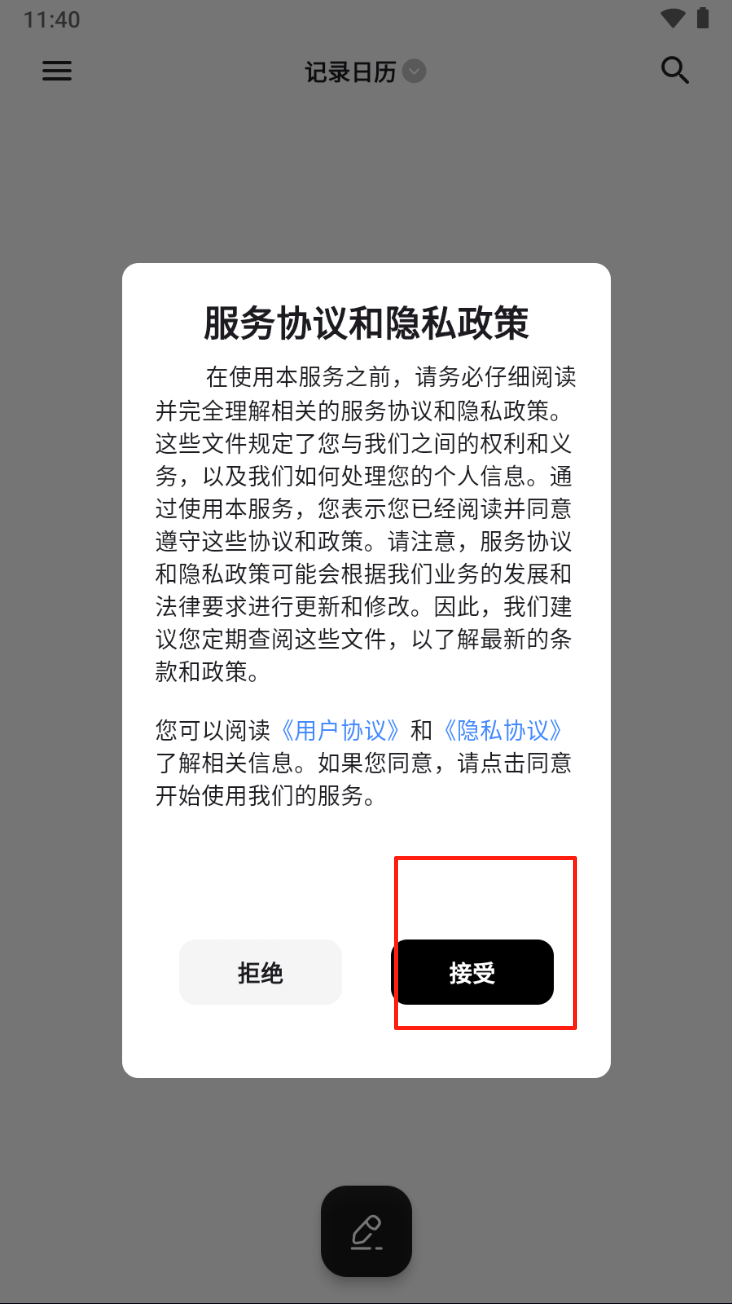 1、接受服务协议和隐私政策:阅读并点击“接受”以同意服务协议和隐私政策。