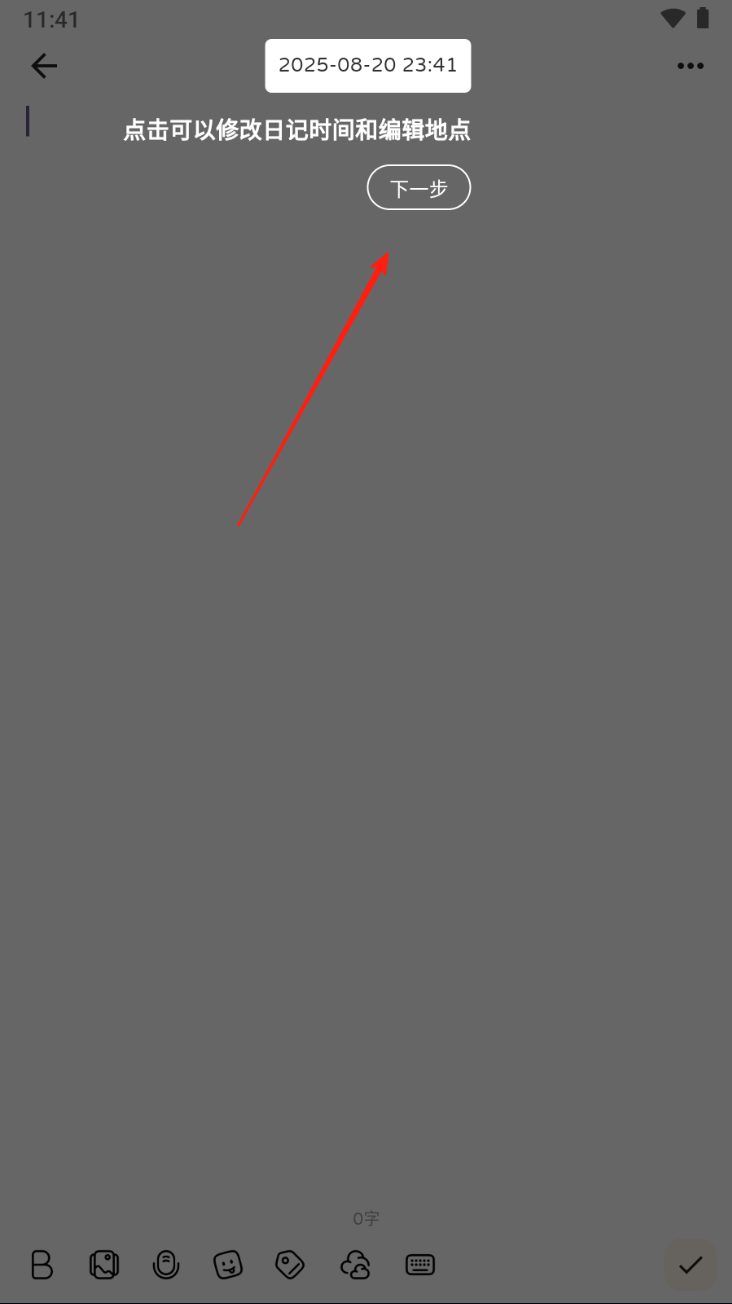 3、编辑日记内容:点击日记时间,修改时间和编辑地点后点击“下一步”。