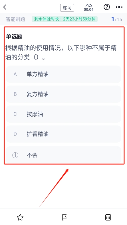 芳香疗法师考试聚题库集成了丰富的学习资源和智能化的备考工具,能够有效提升考生的学习效率和应试能力。通过多样化的练习模式和准确的错题分析,用户能够做到有的放矢,快速巩固知识,以上优势使得该应用成为备考芳香疗法师考试的重要助手。