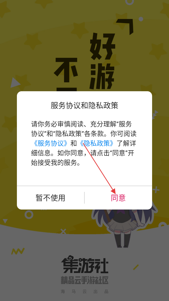 1、打开集游社APP后,在弹出的“服务协议和隐私政策”提示框中,点击【同意】按钮,进入APP首页。