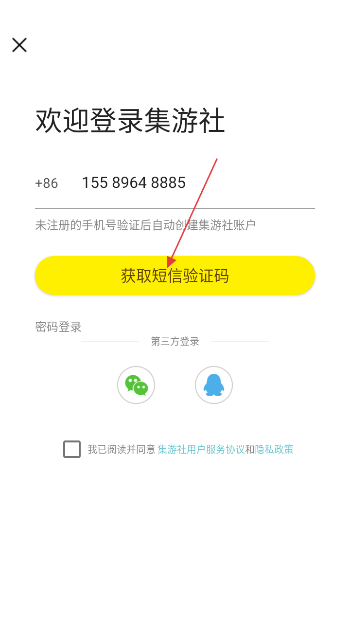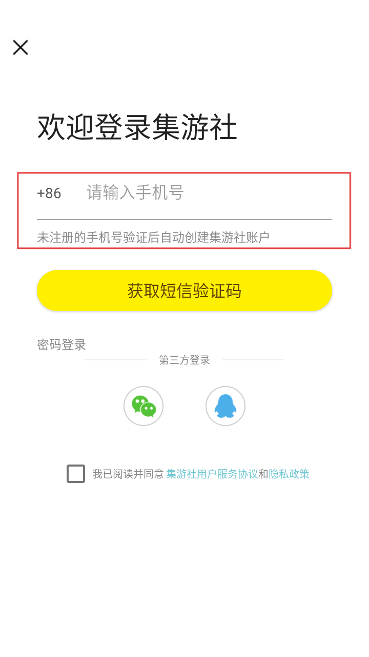 3、在登录页面,输入手机号,勾选“我已阅读并同意集游社用户服务协议和隐私政策”。