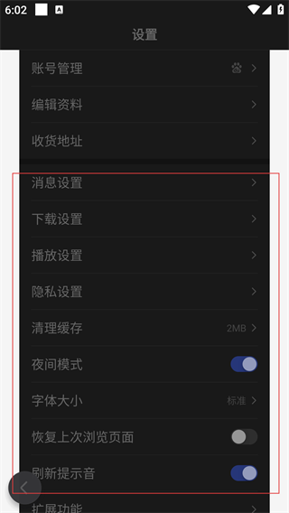3、进入【设置】界面,可管理账号、调整消息/下载/播放等配置,还能开启【夜间模式】等个性化功能。