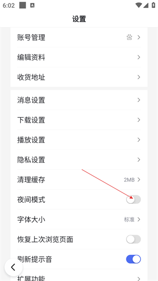 4、在【设置】中开启【夜间模式】后,界面会切换为深色主题,同时可同步调整其他功能的配置状态。