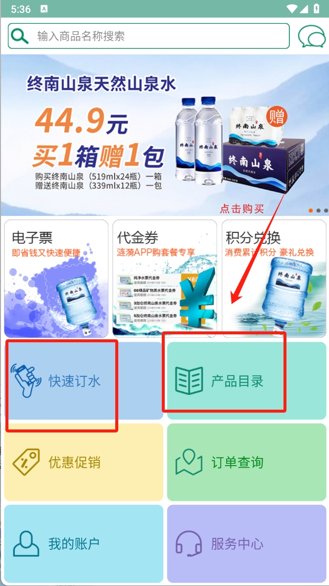 1、首先,打开“快速订水”应用,点击首页的“产品目录”按钮,浏览可订购的各类水产品及套餐信息。
