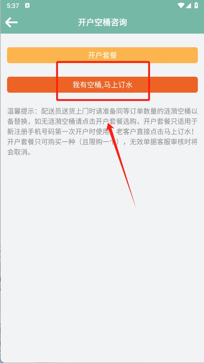 2、然后,如果您已有空桶并希望立即订水,点击“我有空桶,马上订水”按钮,进入订水流程。