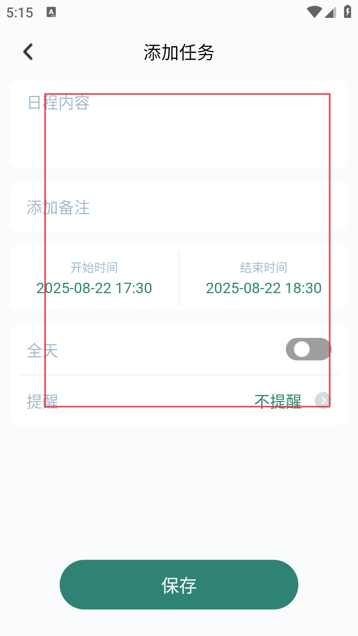3、填【日程内容】【备注】,选开始和结束时间,按需设提醒,点【保存】。