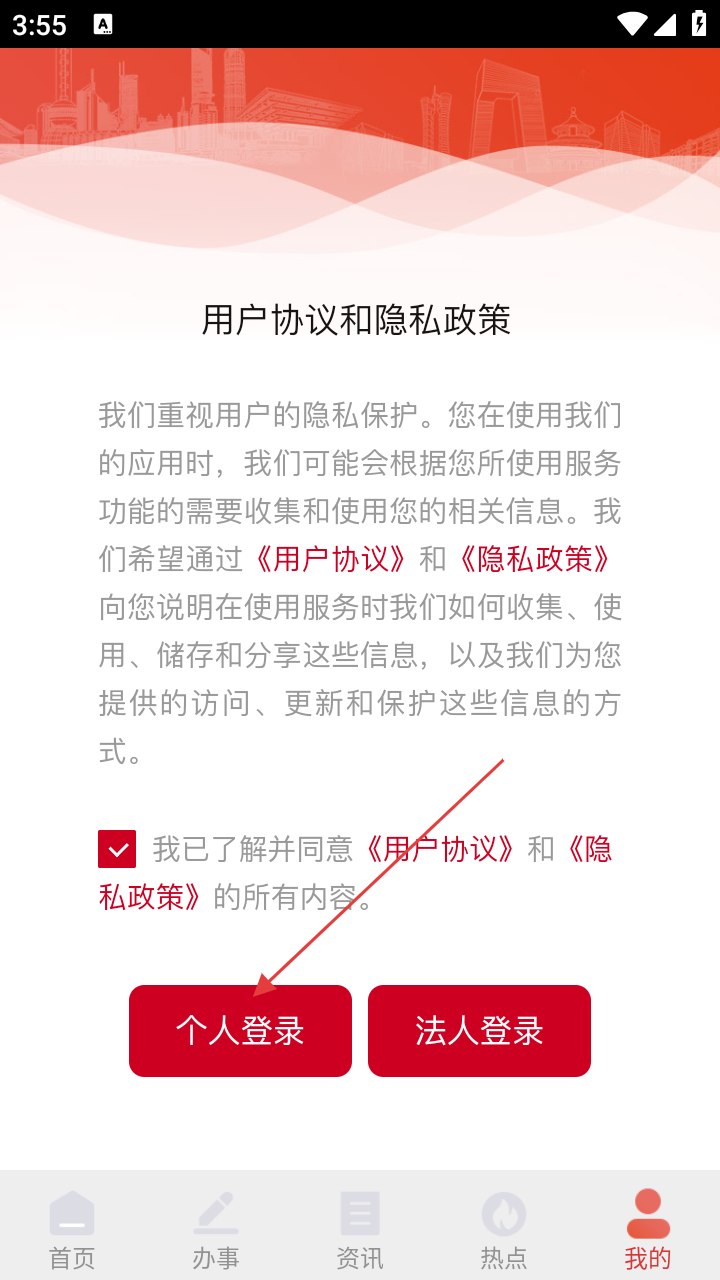 3、在协议页勾选同意后,点击【个人登录】,进入身份认证平台。