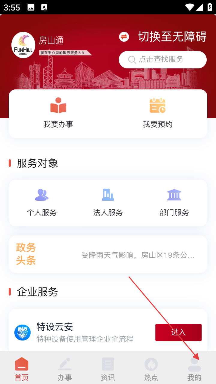 1、打开房山通APP,在首页点击底部【我的】,进入个人中心页。