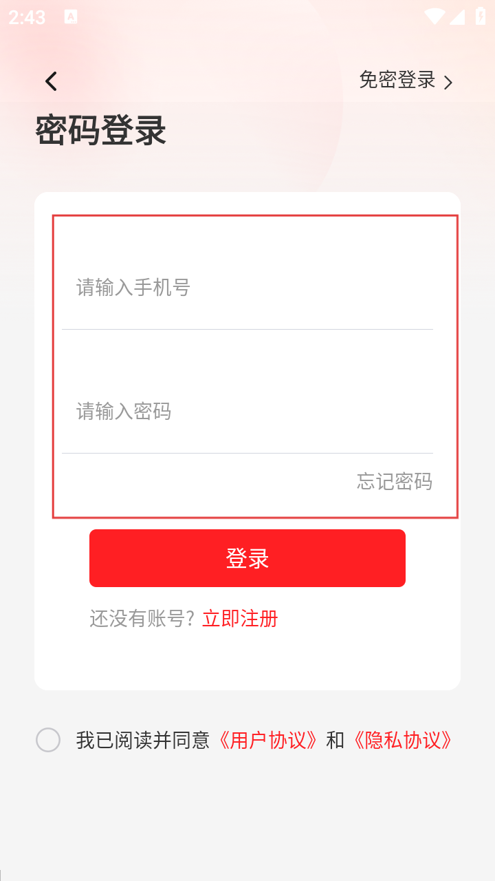 4、在密码登录页,填手机号、密码,勾选协议后点【登录】,完成登录。