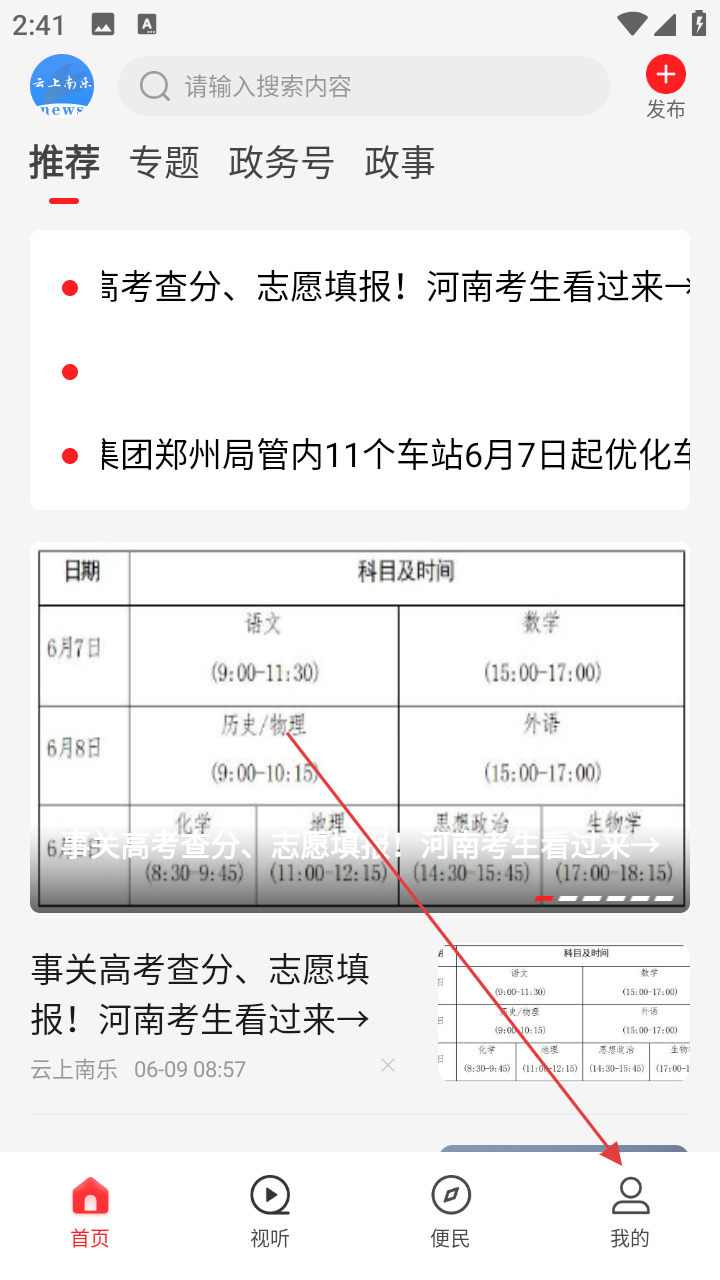 1、打开云上南乐首页,点底部【我的】,进入个人中心页。