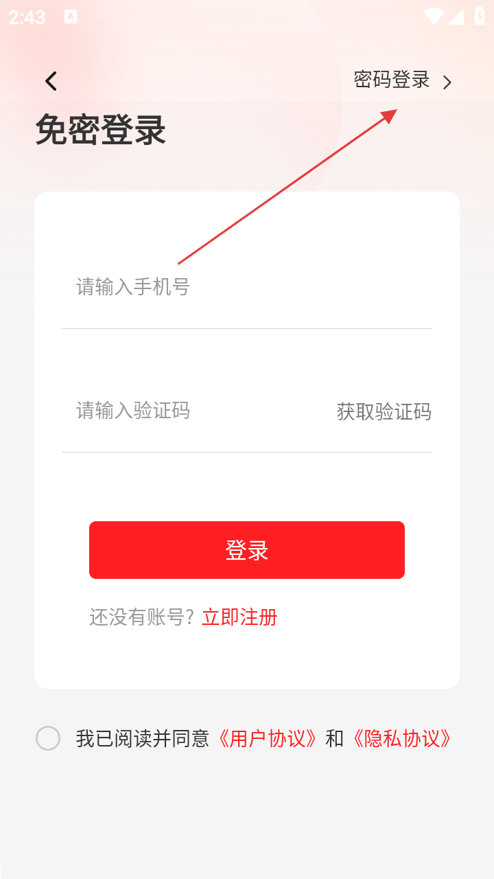 3、在登录选择页,点右上角【密码登录】,切换到密码登录界面。