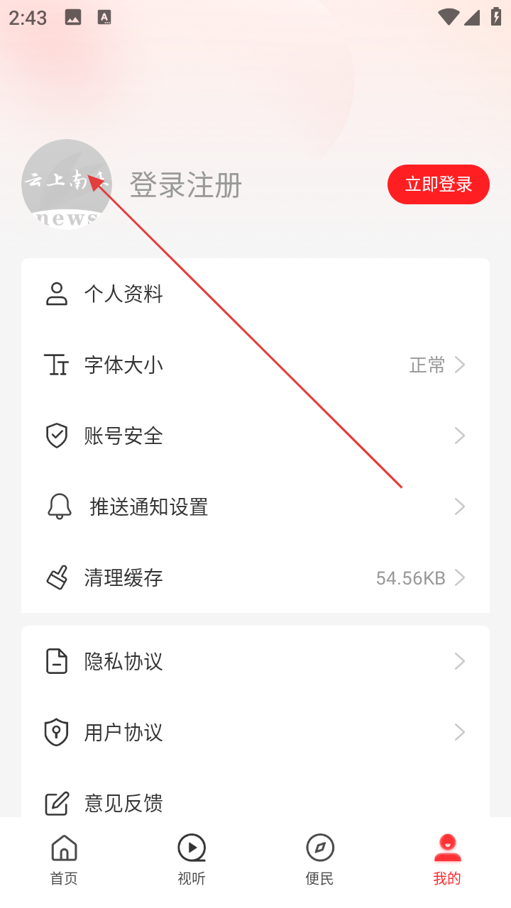 2、在个人中心,点头像旁【登录注册】区域,进入登录选择页。