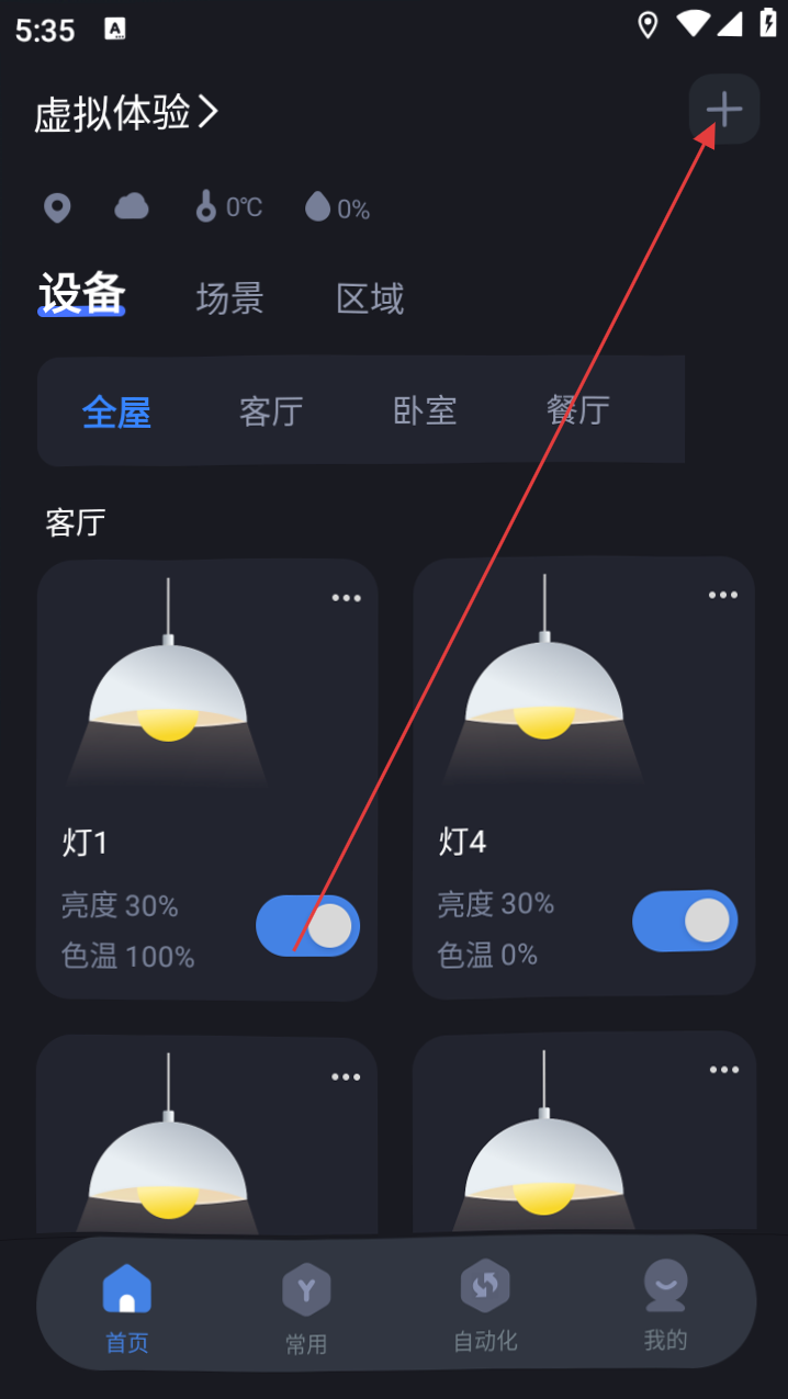 2、登录后进入首页,可看到设备控制等内容,点击右上角【+】号,进入添加场景页面。