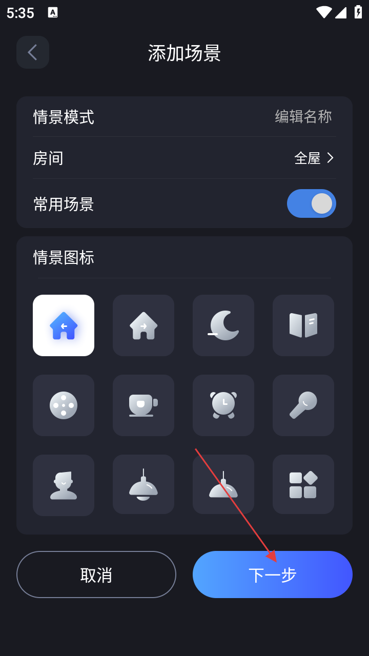 3、在添加场景页面,设置情景模式、房间等信息,选择情景图标后点击【下一步】。