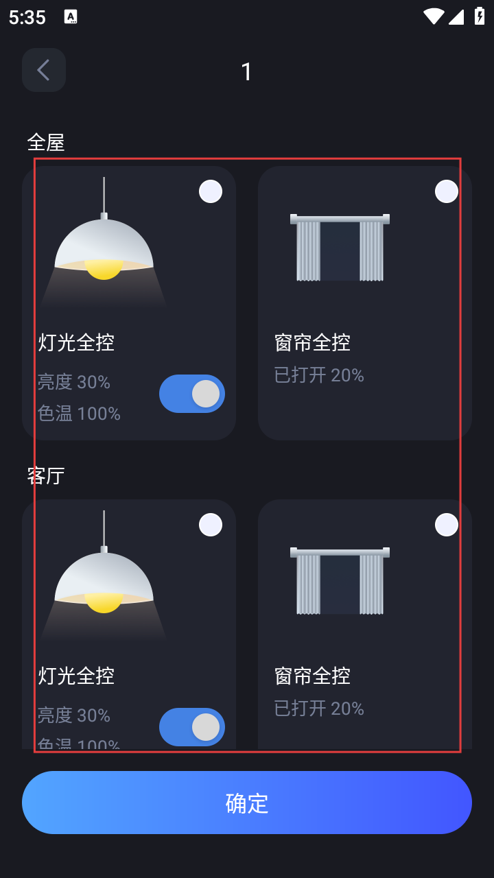 4、在设备选择页面,勾选全屋或客厅的灯光、窗帘等设备,最后点击【确定】,即可完成智能场景添加。
