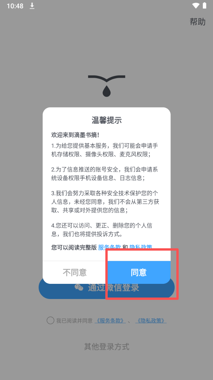 1、在登录界面,阅读温馨提示并点击“同意”以接受服务条款和隐私政策。