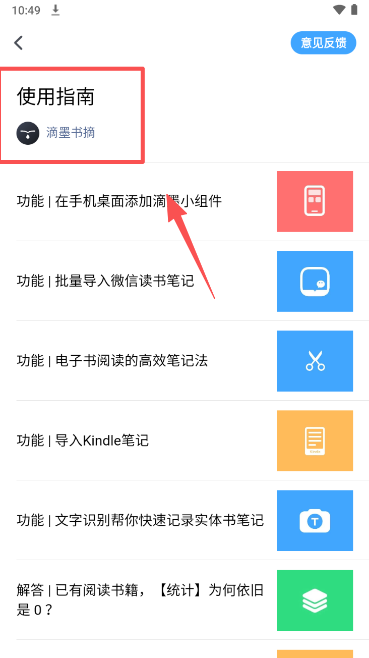 4、在功能列表页面,点击“使用指南”以了解滴墨书摘的使用方法和功能。