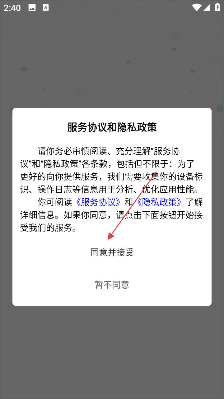 1、打开“扫微”APP,在弹出的“服务协议和隐私政策”窗口中,点击【同意并接受】按钮。