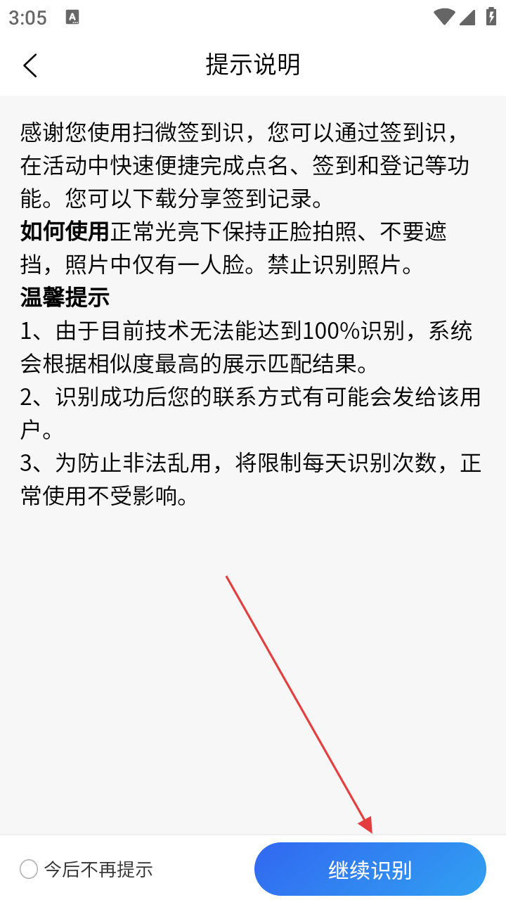 4、在提示说明页面,点击【继续识别】按钮,即可使用签到识功能,在活动中快速便捷完成点名、签到和登记等操作。