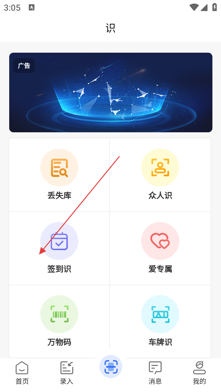 3、在功能选择页面,点击【签到识】选项,进入提示说明页面。