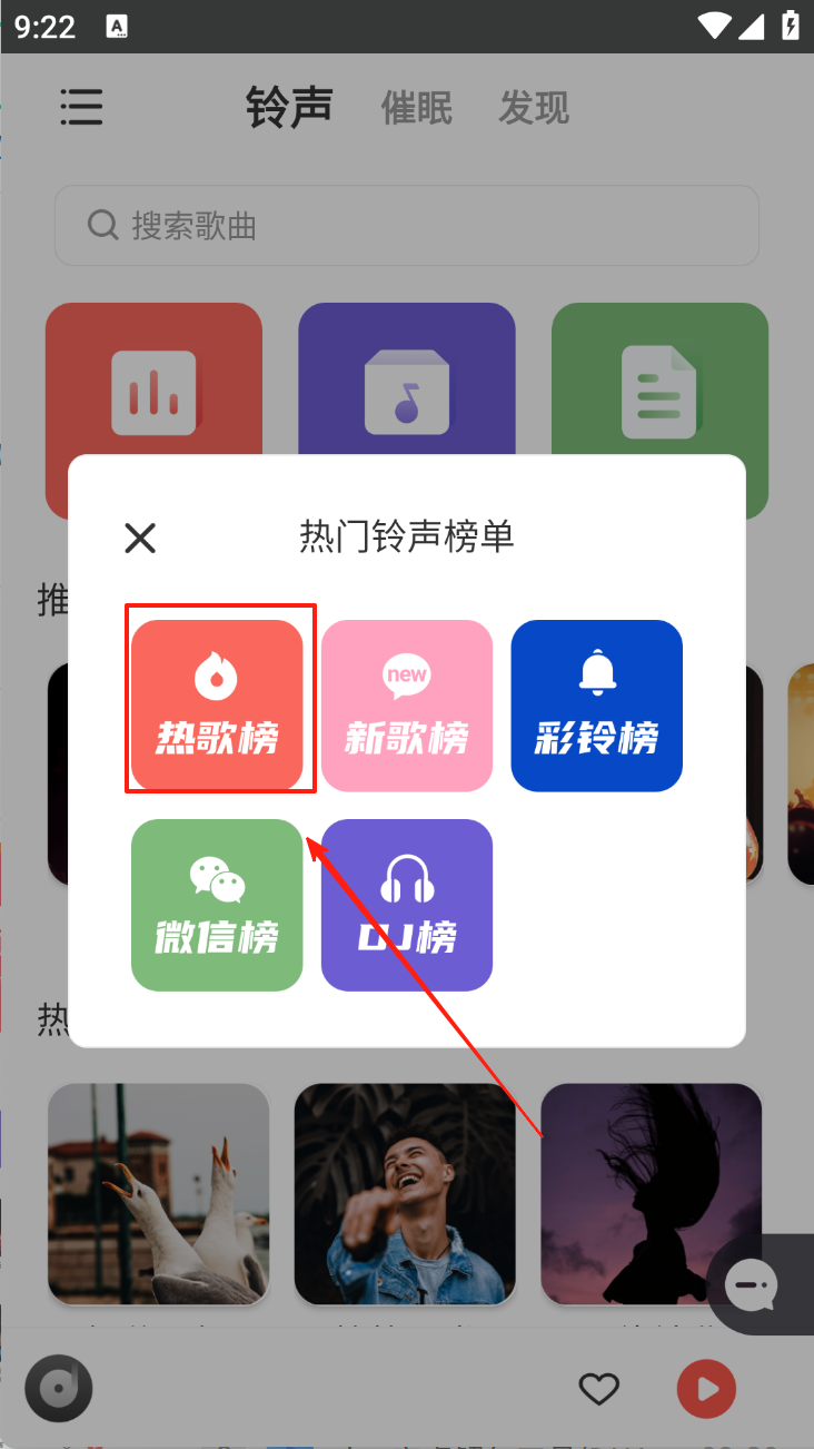 2、选择“热歌榜”查看当前热门歌曲。在热门铃声榜单中,选择热歌榜查看热门歌曲列表。