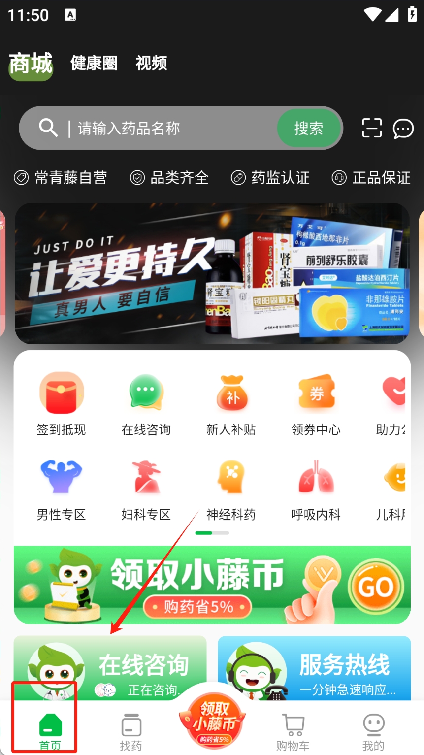 1、进入医药电商App首页,点击底部导航栏的“首页”,浏览推荐药品和健康服务。