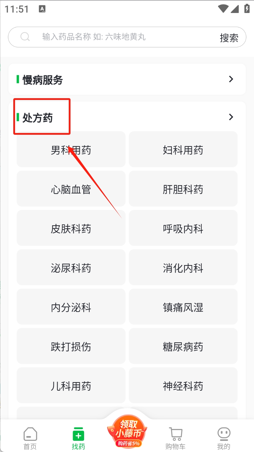 3、点击“找药”按钮,选择药品分类如“处方药”,查找特定药品并进行购买。