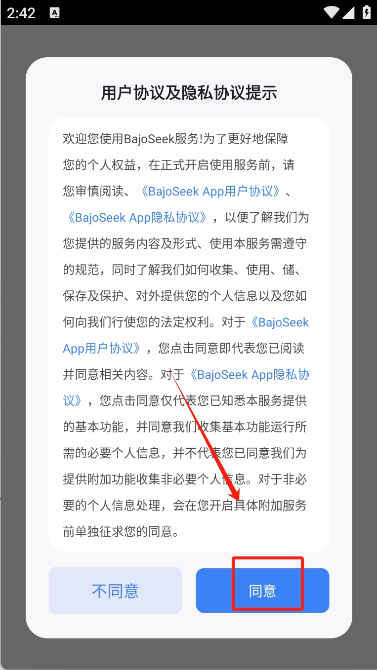 1、阅读并同意用户协议及隐私协议。点击“同意”以继续操作。