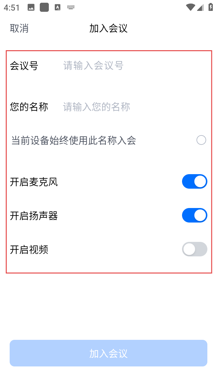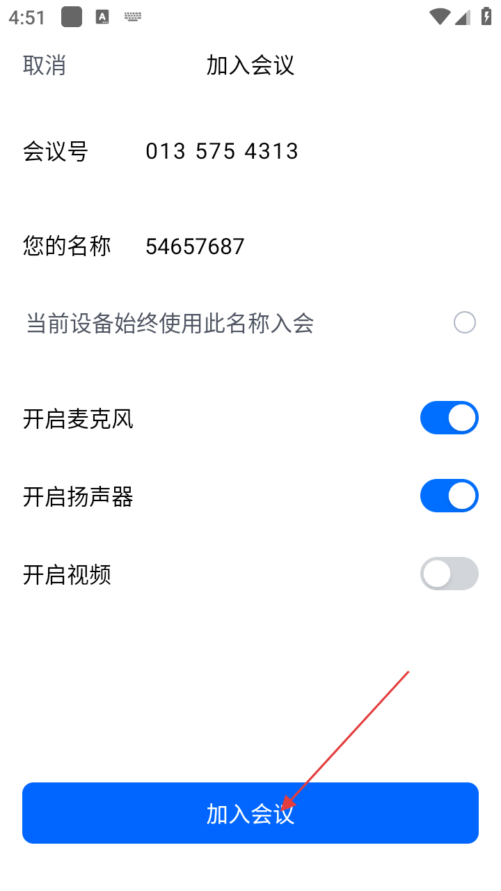 3、完成会议号、名称及相关设置后,点击底部【加入会议】按钮,即可进入会议。