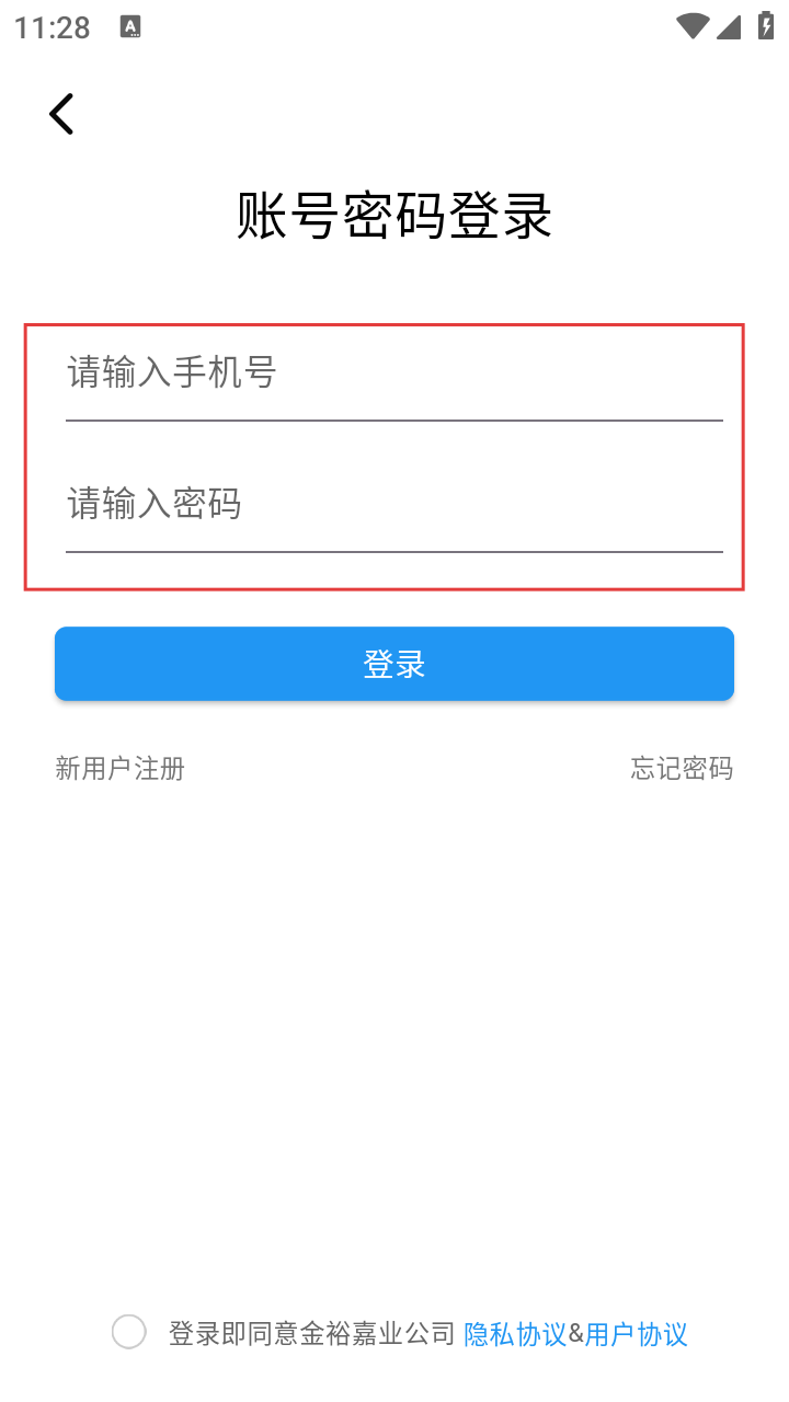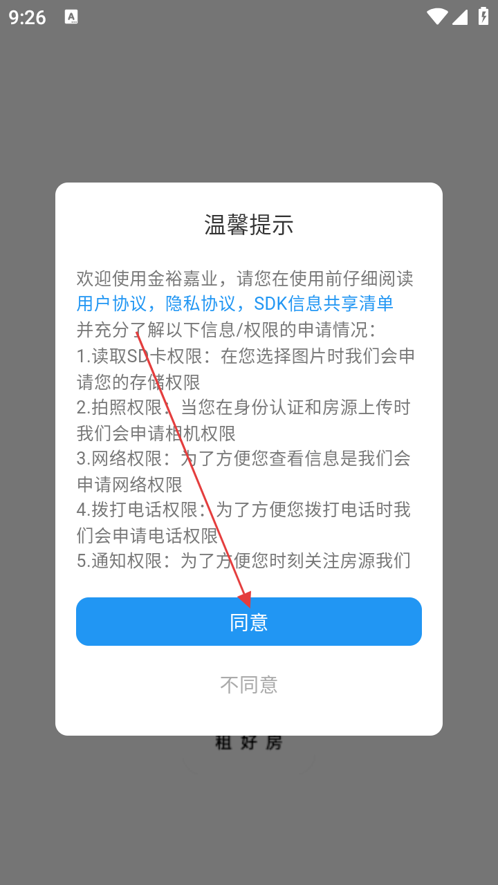1、使用金裕嘉业前,阅读【用户协议】【隐私协议】等,点【同意】授权权限。