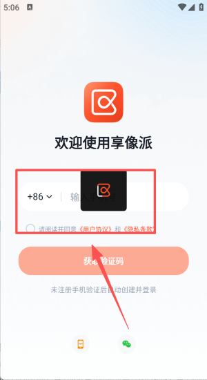 2、输入手机号获取验证码未注册号码将自动创建账户并登录。