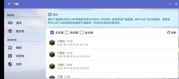6、添加游戏版本。1.19.3版本可能无法进入游戏,但1.19.3以下版本是没有问题的,所以这里使用1.19演示。点击下载。