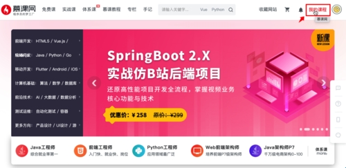 第一步:访问并登录慕课网www.imooc.com,在页面右上角找到「我的课程」。