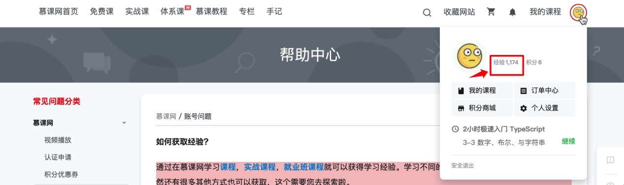 3、您可以在个人中心查看到自己的经验值。您也可以在慕课网网站顶部找到自己的头像下拉看到自己的经验。
