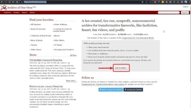2、由于AO3的注册是邀请制,所以我们要点上图的【Get Invited】获取邀请注册。