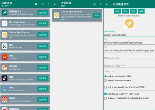 5、但是这款App装在手机上是没有图标的,该如何手动打开呢?课代表发现了一款叫做“创建快捷方式”的App,也放在安装包里面了,使用这个App,找到Galaxy App Booster,并创建快捷方式即可~