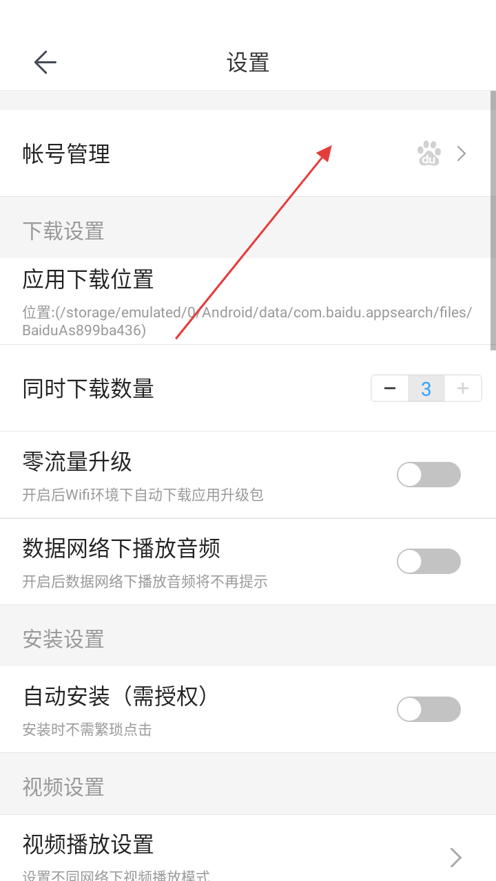 3、在设置界面,点击【帐号管理】进入账号管理页面,还能对下载设置、安装设置、视频设置等进行设置。