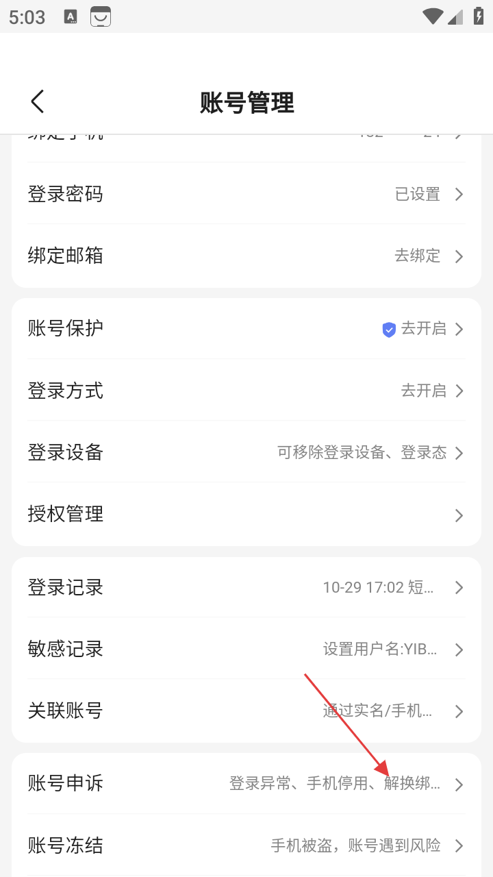 4、在账号管理页面,点击【账号申诉】,可在登录异常、手机停用、解换绑等情况下进行账号申诉操作。