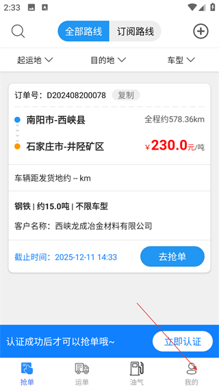 1、进入货运抢单类App的抢单页面,可查看订单信息,需完成认证后才能抢单。
