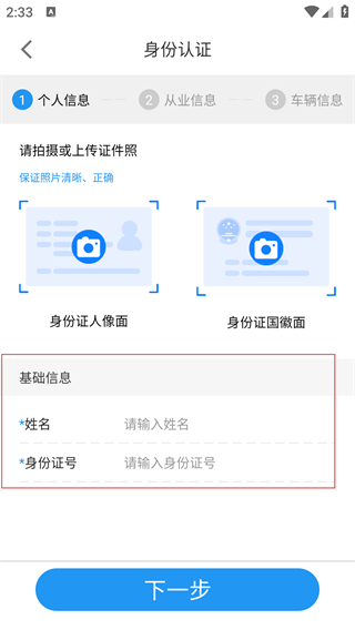 4、信息填写完成后,点击【下一步】,继续完成从业信息、车辆信息的认证流程,完成后即可解锁抢单功能。