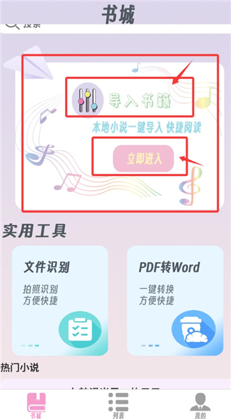 1、启动燃文小说阅读器后,您可以借助导入书籍的功能来加载本地的电子书文件,也能够直接使用站内的资源。